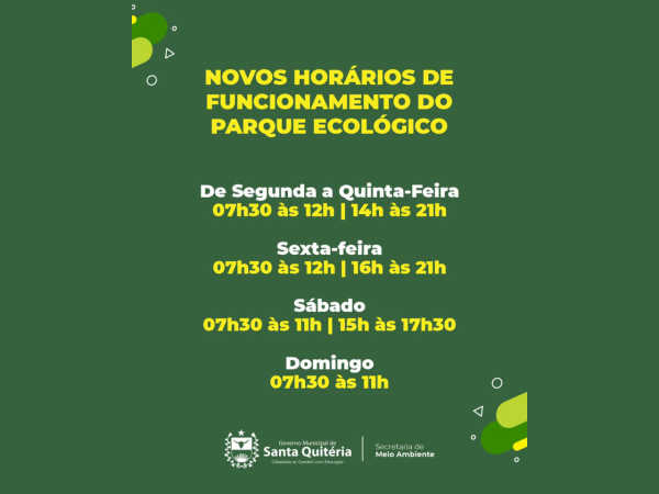 Confira os novos horários de funcionamento do Parque Ecológico de Santa Quitéria! O parque recentemente foi reinaugurado, com nova estrutura para lazer e entretenimento dos quiterienses
